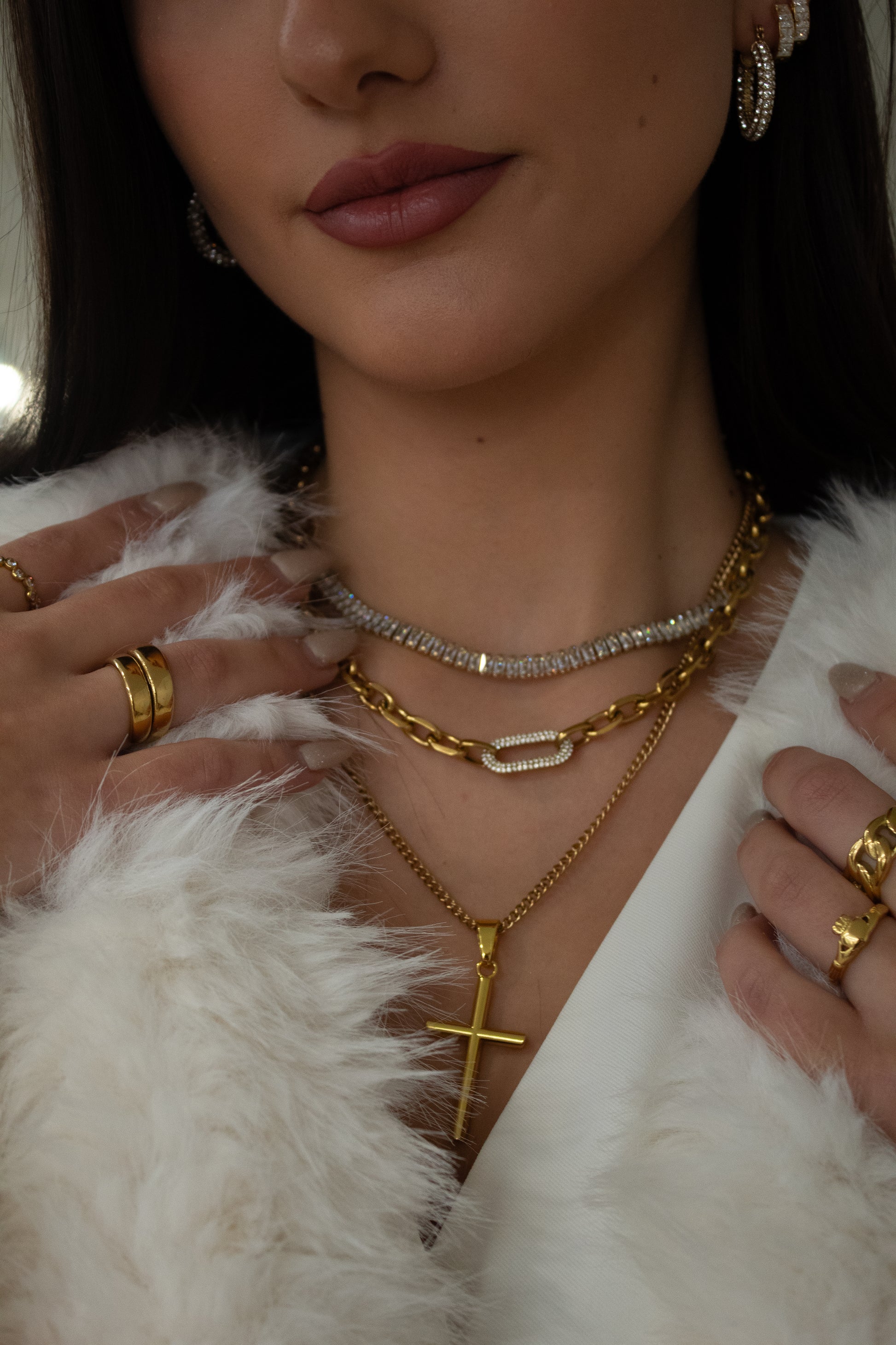 Melanie Necklace it is crafted by a cross made by Alloy and a chain18k gold plated that will not taarnish. It is perfect to be wear in casual looks but also looks so pretty with a V neck type either a dress or top . Also our chain is made by stainless steel that will ensure durability.